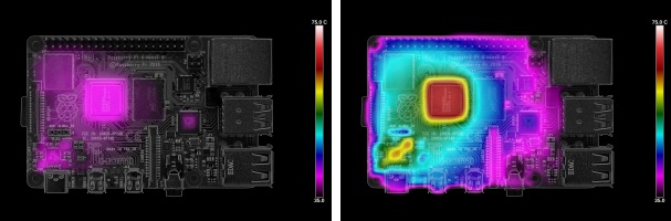 La caméra thermique montre bien la réduction des températures que permet la dernière mise à jour du firmware. Retrouvez le test complet sur raspberrypi.org